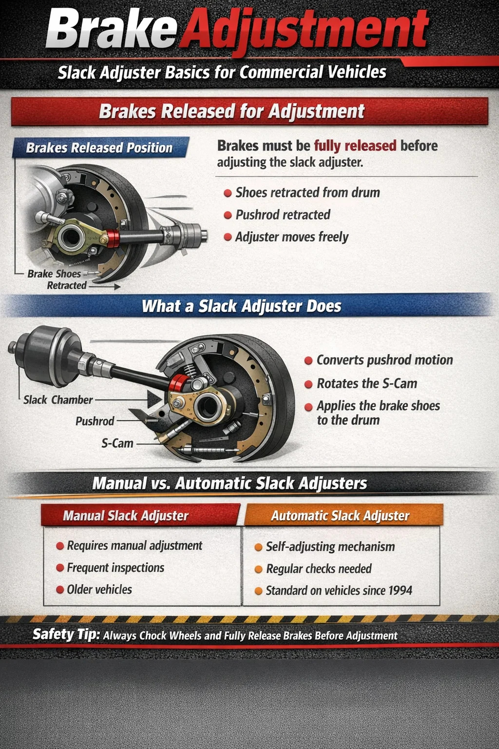 Manual slack adjuster adjustment is a straightforward procedure when done correctly. The following steps apply to S-cam drum brake systems, which remain the most common configuration on North American commercial vehicles.