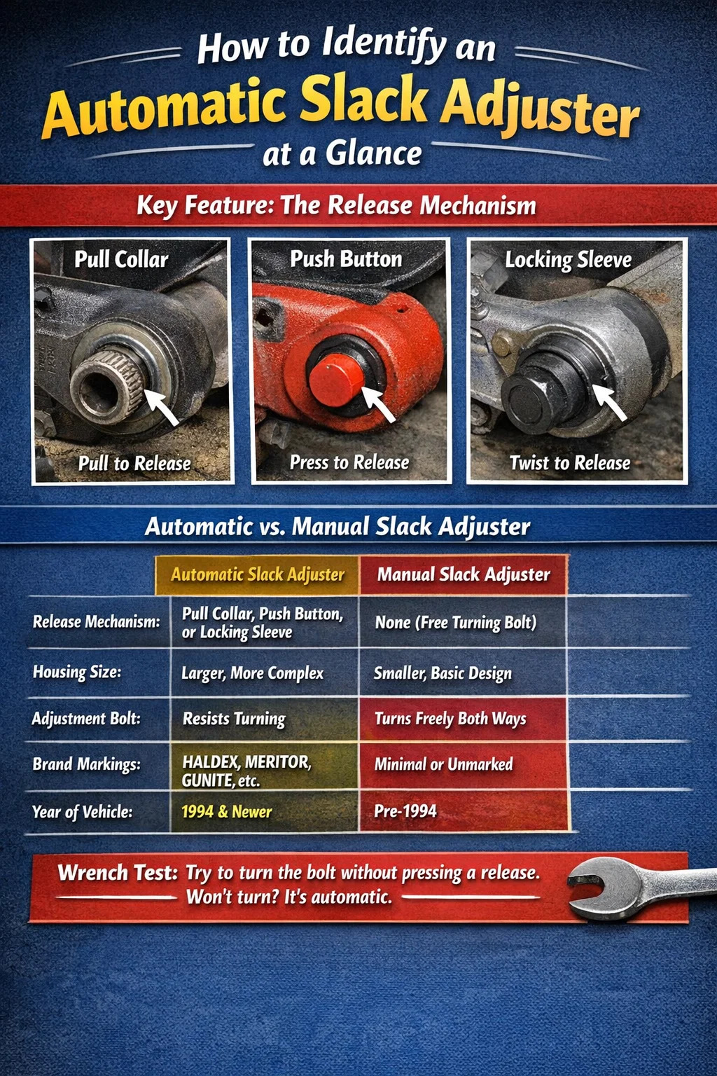 Pre-1994 vehicles — older single-axle straight trucks, vintage trailers, some transit buses — may legitimately still run manual adjusters. The identification method differs for these, which is covered in a dedicated section below.