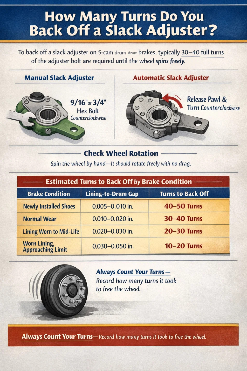 The number of turns needed to back off a slack adjuster is directly related to how far the lining currently sits from the drum. The table below provides practical estimates based on lining condition: