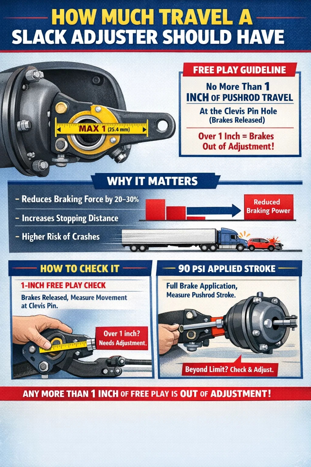 A slack adjuster — whether manual or automatic — should have no more than 1 inch (25.4 mm) of pushrod travel measured at the clevis pin hole when the brakes are fully released. This is the standard set by the Federal Motor Carrier Safety Administration (FMCSA) under 49 CFR Part 393.47, and it applies to commercial motor vehicles operating on U.S. roads.
