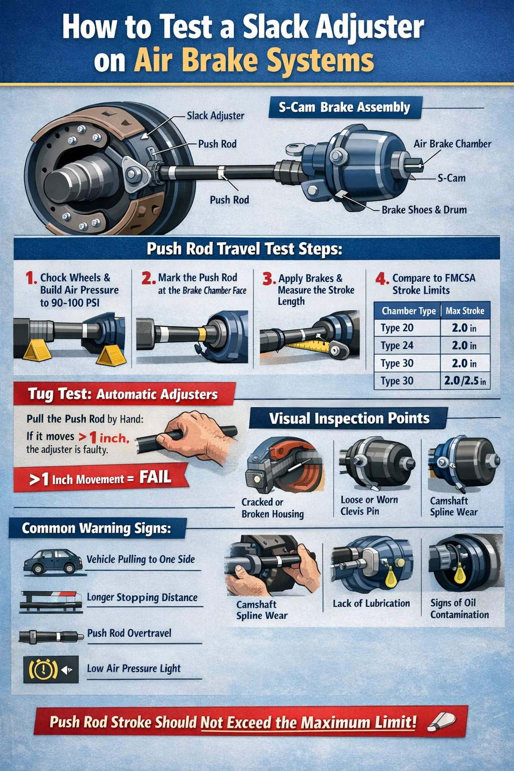 This test is a quick screening tool. A slack adjuster that fails the tug test will almost certainly also exceed push rod stroke limits during a brake application test. However, a slack adjuster can pass the tug test but still fail the stroke measurement — which is why both tests should be performed together during a thorough inspection.