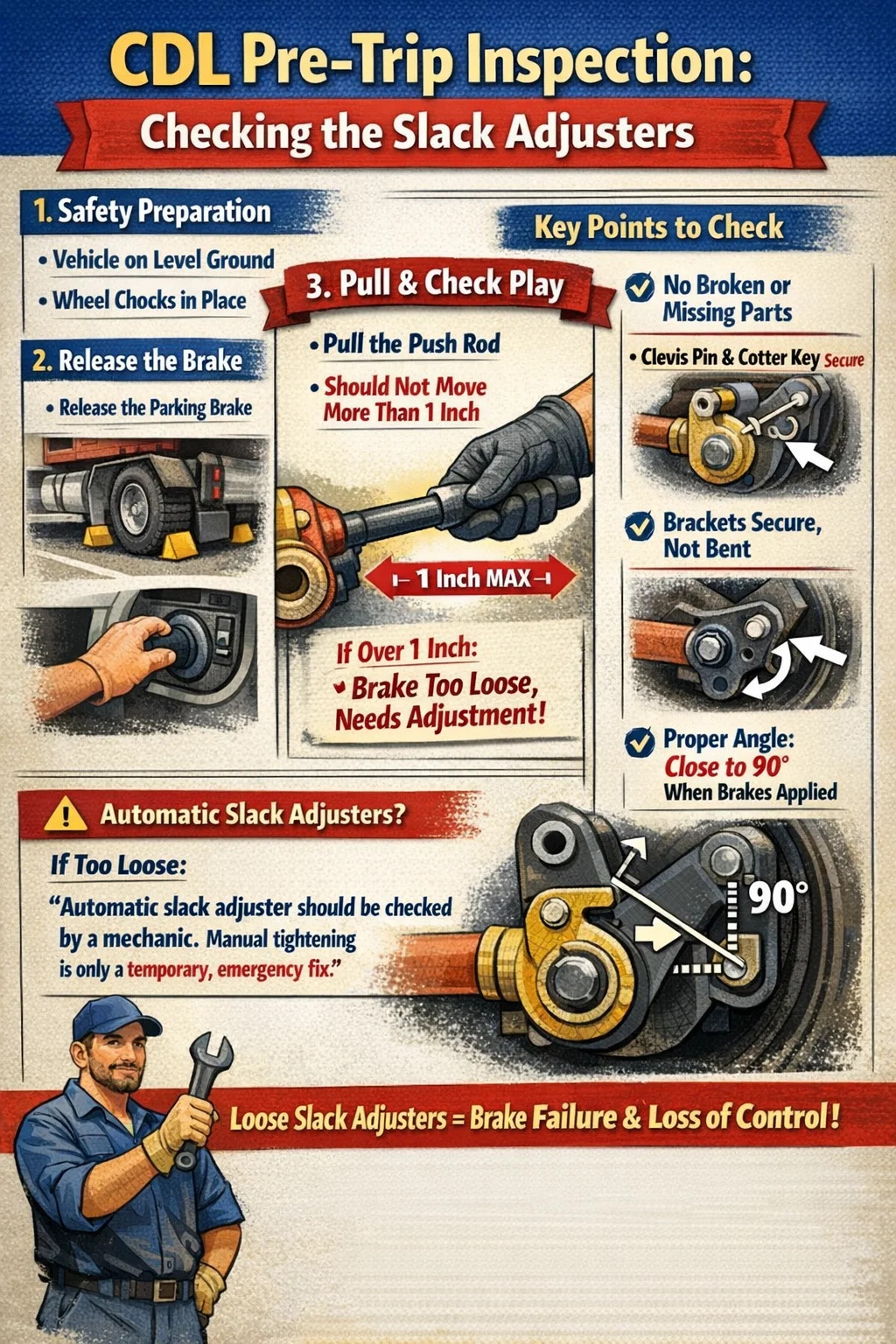 Don't say "tighten it manually": Tell the examiner that if an automatic slack adjuster has too much play, it usually means it's broken or there's a problem elsewhere in the braking system, requiring a mechanic's inspection, not simply manual tightening. Manual adjustment is only a temporary emergency measure and doesn't solve the underlying problem.