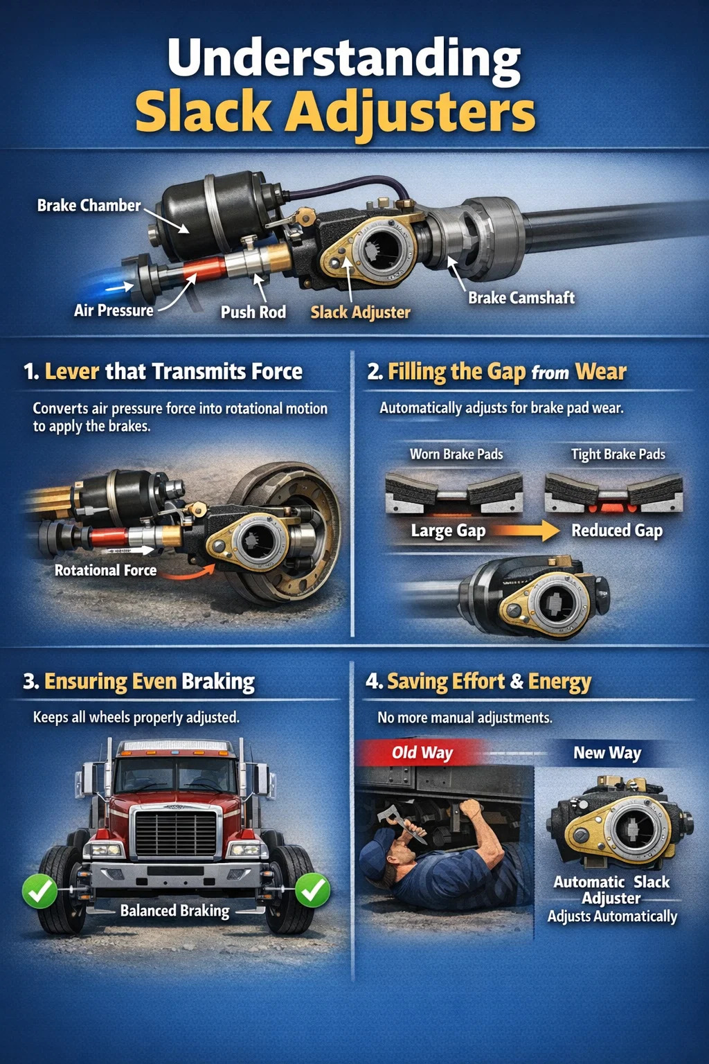 Slack adjusters (especially automatic ones) ensure that the brake clearance of each wheel is approximately the same.