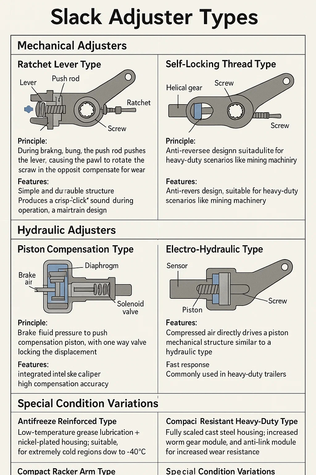 Principle: During braking, the push rod pushes the lever, causing the pawl to rotate the ratchet, resulting in a slight extension of the screw to compensate for wear slack.